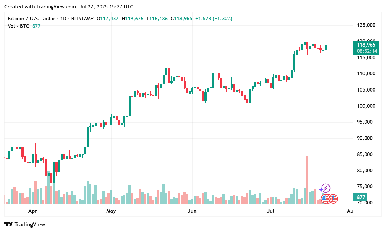 Bitcoin hat seine Allzeithochs zurückerobert, notierte im Juni meist über 110.000 $ und konsolidiert seither in einer Spanne. On-Chain-Daten zeigen, dass große Wale akkumulieren: Langfristige Inhaber bauen ihre Positionen aus und ziehen Angebot von den Börsen ab.
