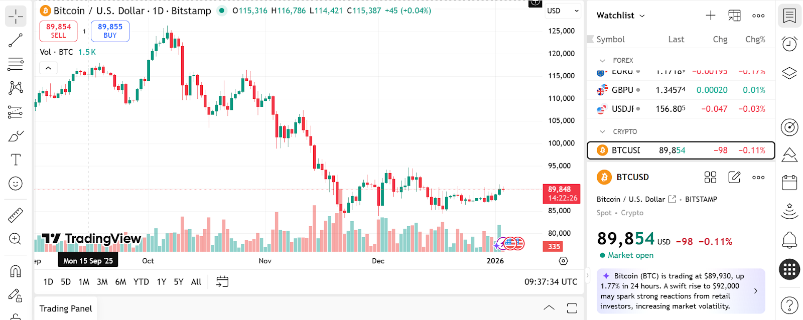 Bitcoin wird aktuell bei 89.854 US-Dollar gehandelt, mit einer Marktkapitalisierung von rund 1,8 Billionen US-Dollar und einem 24-Stunden-Handelsvolumen von über 44 Milliarden US-Dollar – damit bleibt BTC unangefochten auf Platz eins. Analysten, die Bitcoin-News verfolgen, betonen, dass die Fähigkeit von BTC, nach einem starken Anstieg höhere Niveaus zu halten, zu einer allmählichen Akkumulation durch Trader führt, die Bitcoin weiterhin als digitales Reservevermögen sehen.