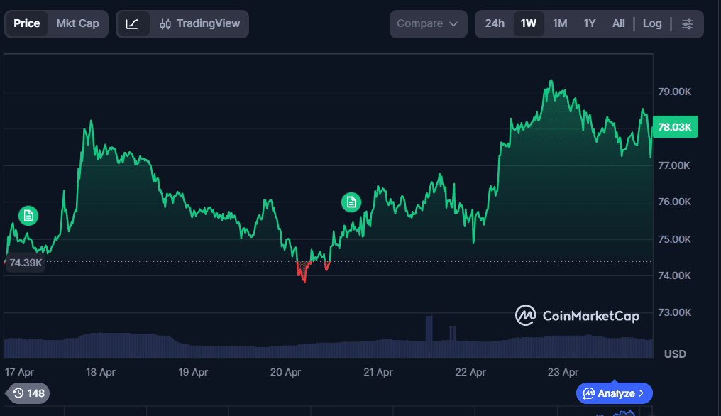 Die Kryptowährung überschritt am Mittwochmorgen die Marke von 78.000 US-Dollar, was einem Anstieg von 2,2 % innerhalb von 24 Stunden und 4,3 % auf Wochensicht entspricht, nachdem Präsident Donald Trump angekündigt hatte, dass der Waffenstillstand mit dem Iran auf unbestimmte Zeit verlängert werde, sowie nach dem Kauf von 34.164 BTC durch Strategy im Wert von 2,54 Milliarden US-Dollar.