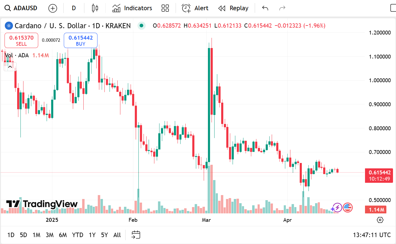 Technische indicatoren suggereren dat ADA een ‘higher low’ vormt op de dagelijkse grafiek. Als het weerstandsniveau van $0,65 wordt doorbroken, zou het token richting $1 kunnen gaan. Van daaruit is een klim naar $5 en hoger steeds plausibeler, vooral als er macro-economische steun is.
