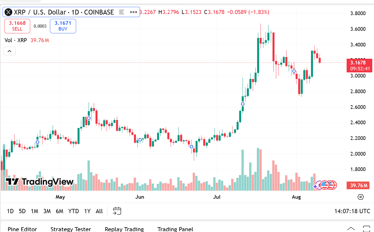 Der XRP-Preis hingegen hat einen Rückschlag erlitten und liegt bei 3,19 $, was einem Minus von 4,01 % entspricht. Trotz einer enormen Marktkapitalisierung von 189,23 Milliarden $ ist das Handelsvolumen um 12,51 % auf 6,41 Milliarden $ gesunken – ein Zeichen für vorsichtige Anlegerstimmung angesichts anhaltender regulatorischer Herausforderungen.