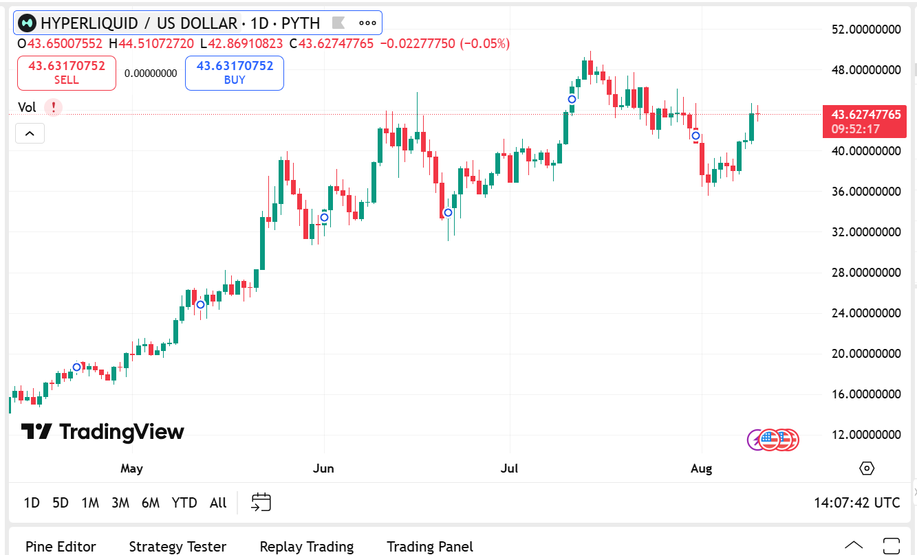 Hyperliquid (HYPE), der andere große Akteur, notiert bei 43,68 $ mit einer Marktkapitalisierung von 14,58 Milliarden $. Das Handelsvolumen verzeichnet einen moderaten Anstieg von 2,05 % auf knapp 299 Millionen $, was auf ein stetiges, aber vorsichtiges Interesse hinweist.