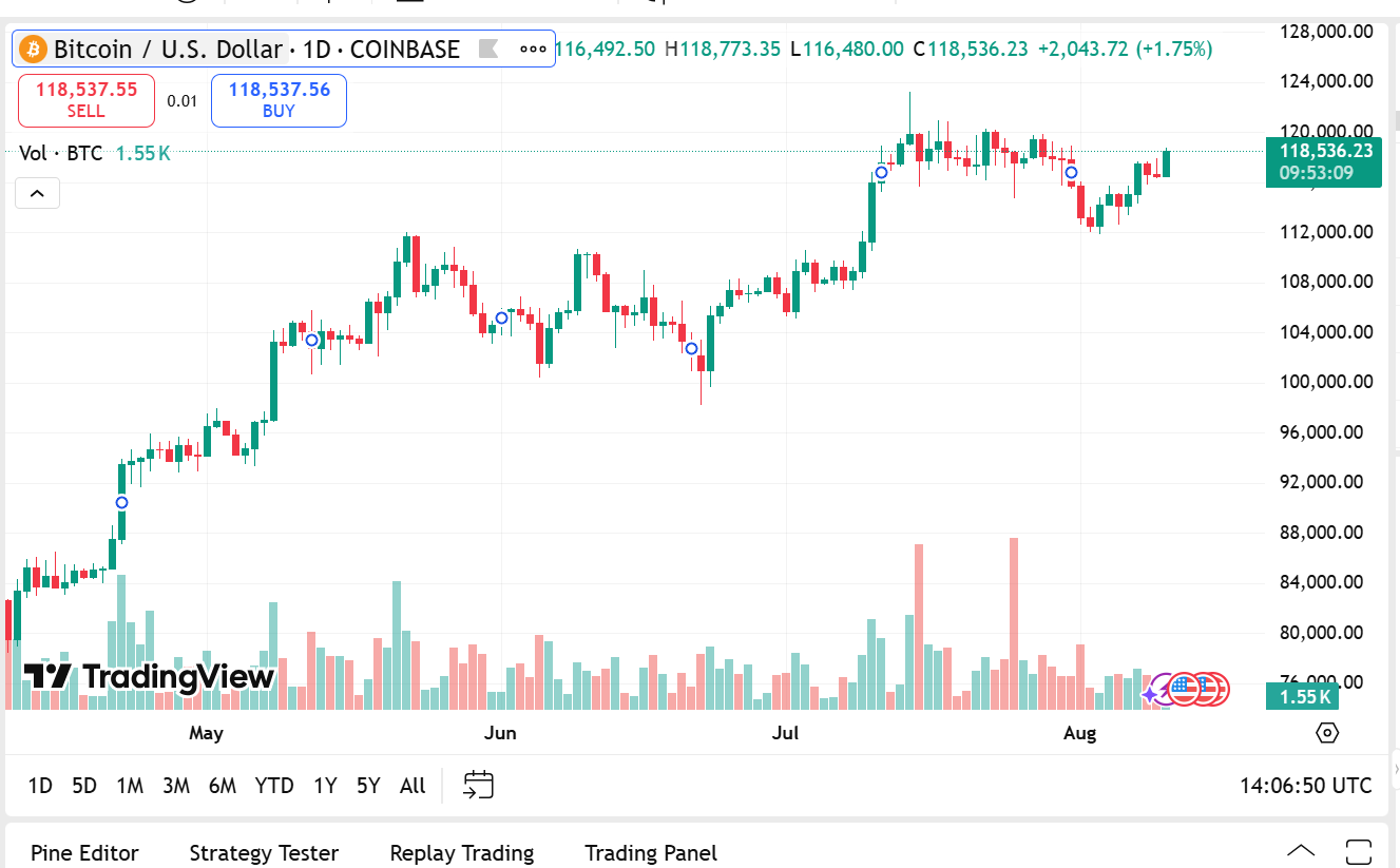 Bitcoin ist weiterhin der Marktführer und wird bei 118.497,19 $ gehandelt, ein Plus von 1,36 % in der jüngsten Vergangenheit. Die Marktkapitalisierung beträgt beeindruckende 2,35 Billionen $, während das Handelsvolumen um 5,36 % auf 60,58 Milliarden $ pro Tag gestiegen ist. Diese anhaltende Aktivität zeigt die Beständigkeit von Bitcoin als führendem Krypto-Asset.