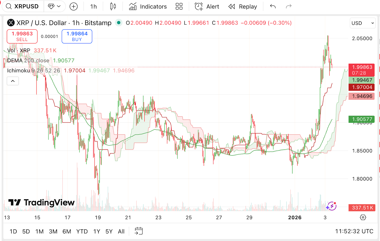 XRP verzeichnet einen deutlichen Anstieg beim Handel und in der Netzwerknutzung. Der Token liegt aktuell bei einem Preis von 1,99 $, was einem Plus von 5,84 % entspricht, und verfügt über eine Marktkapitalisierung von 121,32 Milliarden $. Das Handelsvolumen ist auf 4,15 Milliarden $ gestiegen – ein Anstieg von 142,33 % innerhalb der letzten 24 Stunden.