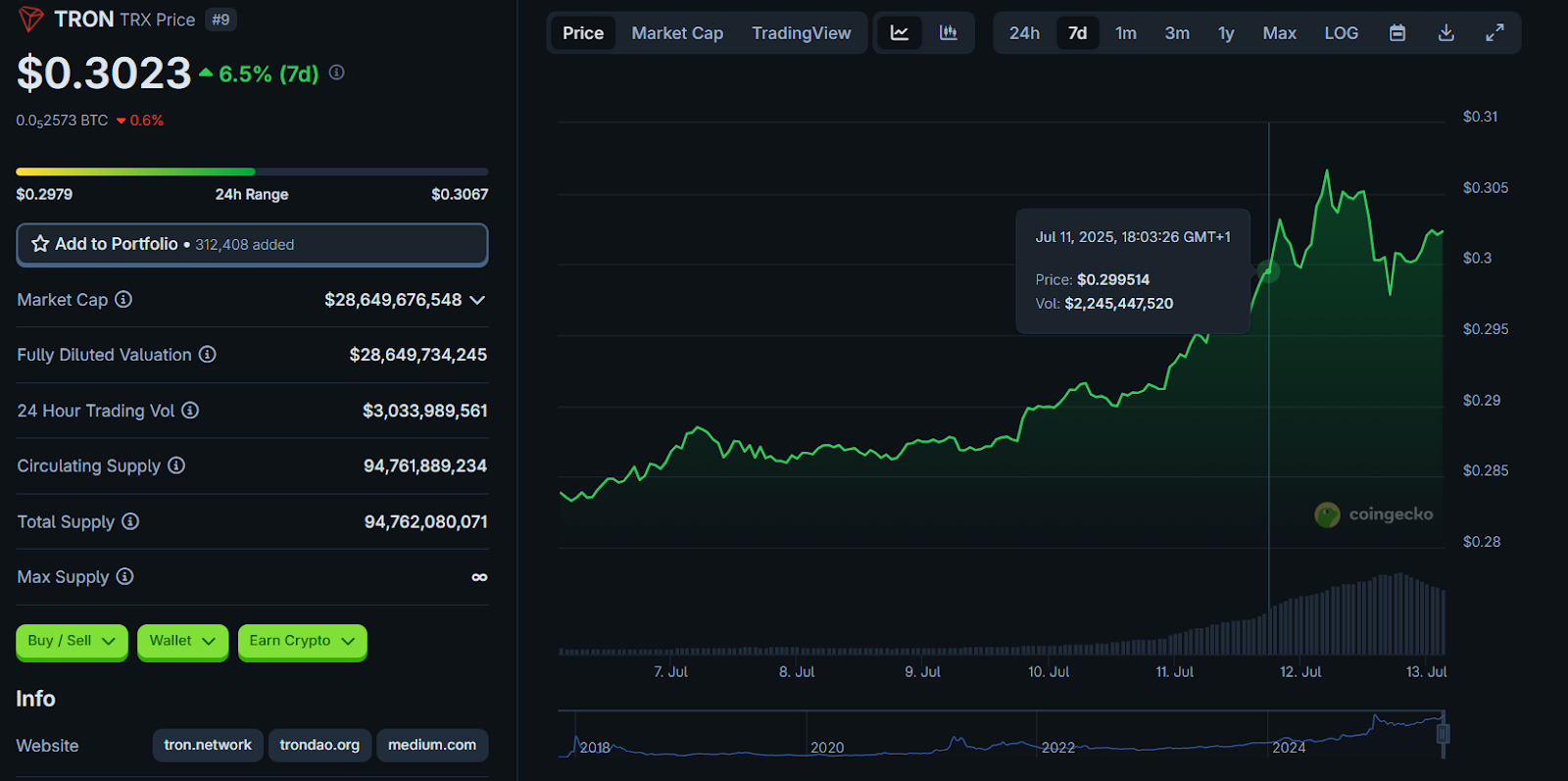 TRX hält sich stark gegenüber Bitcoin – eine Seltenheit unter Altcoins – und steigt kontinuierlich im Kurs. Whale-Akkumulation, ein klarer technischer Aufwärtstrend und makellose Marktstruktur machen Tron zu einem der spannendsten Projekte 2025. Aktuell bei rund 0,30 $, scheint der Weg zur 1-Dollar-Marke realistischer denn je.