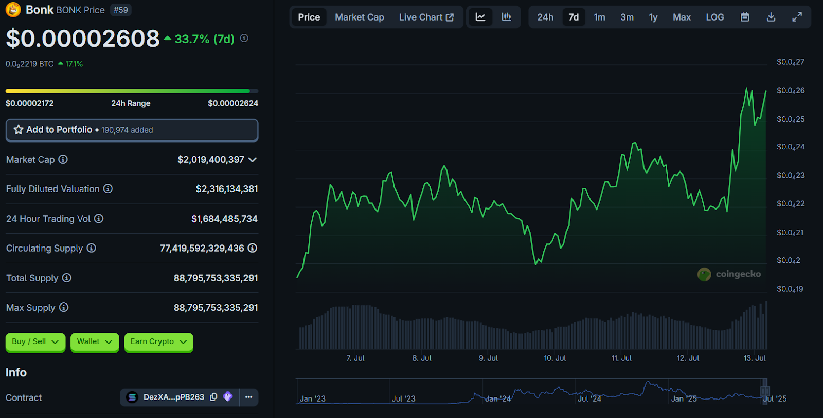 Bonk beweist, dass hundebasierte Meme-Coins noch immer im Trend sind. In den letzten zwei Wochen stieg BONK um 81,1 %, angeheizt durch ETF-Spekulationen und Community-Hype. Tuttle Capital hat einen 2x gehebelten BONK-ETF beantragt, der bereits am 16. Juli starten könnte – ein potenzieller Kurstreiber.