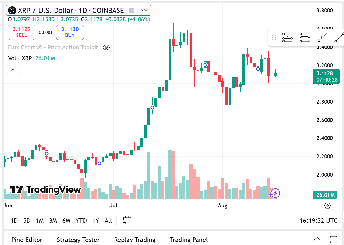 XRP hingegen wird bei 3,11 US-Dollar gehandelt, ein Plus von 2,34 % in den letzten 24 Stunden, während die Marktkapitalisierung bei 184,79 Milliarden US-Dollar liegt, aber das Handelsvolumen mit 5,54 Milliarden US-Dollar um 24,19 % gesunken ist.