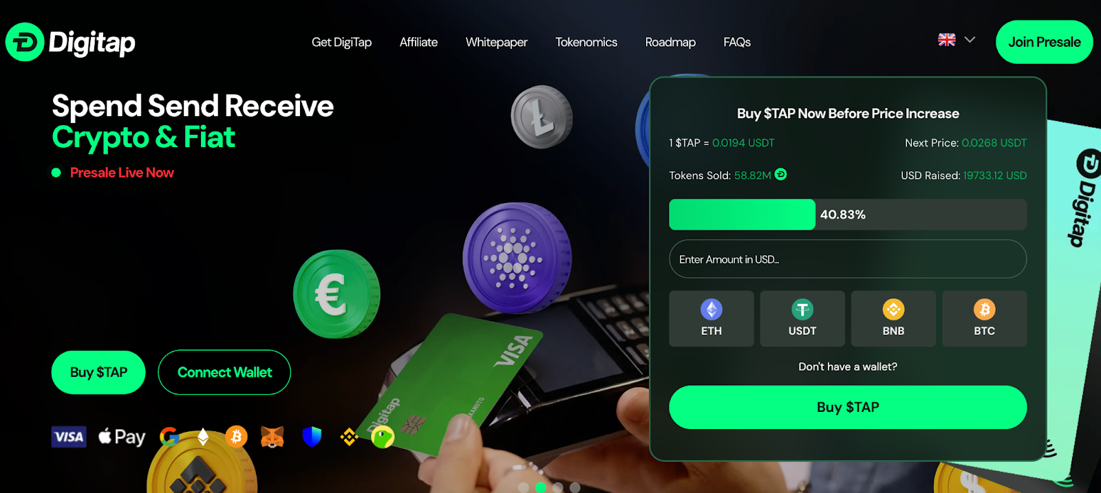 Die jüngste Marktbewegung hat gezeigt, dass Großinvestoren erhebliche Kapitalmengen in aufstrebende Projekte verlagern. Eines der auffälligsten Beispiele ist Digitap ($TAP), ein schnell wachsender Fintech-Altcoin, der zuvor bei 0,0125 $ notierte. Analysten gehen davon aus, dass er einer der besten Altcoins zum Investieren sein könnte – mit einem Potenzial auf das 100-Fache.
