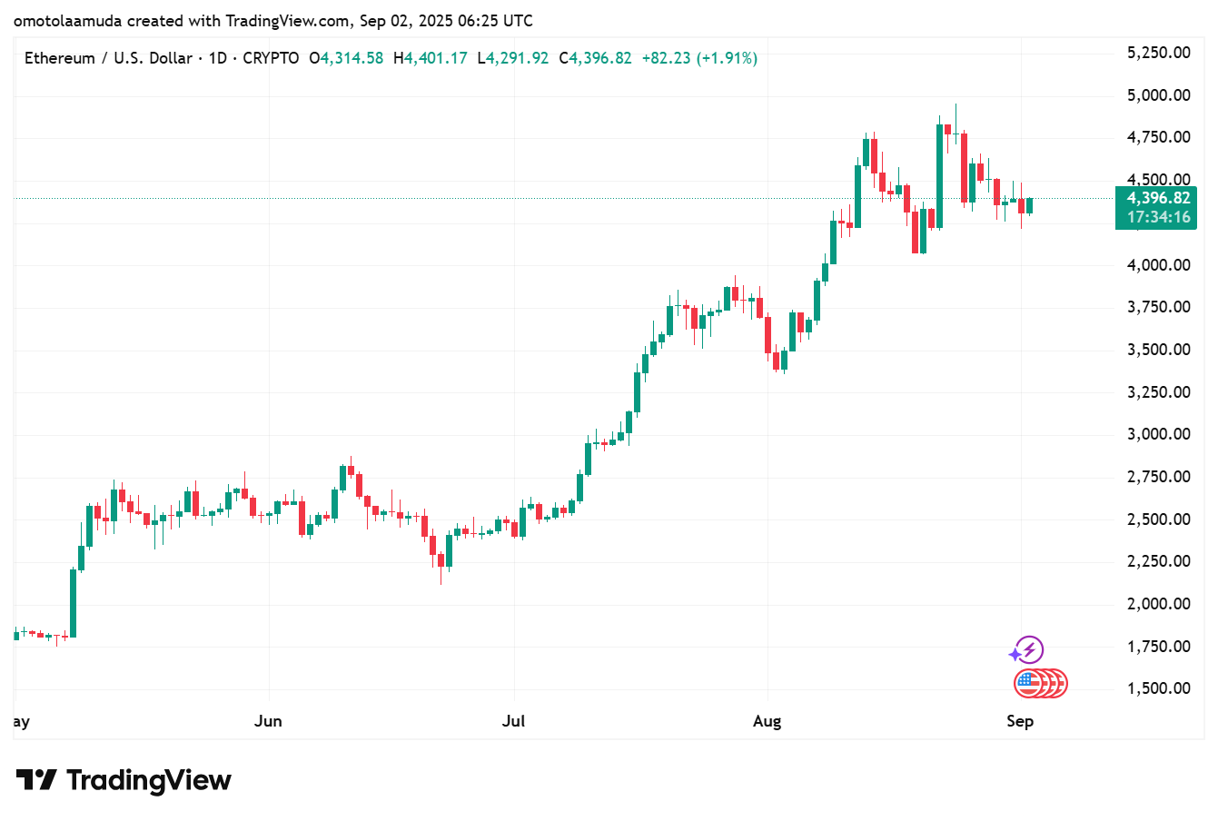 Ethereum (ETH) stabilisiert sich bei 4.396 US-Dollar, nachdem es Mitte August kurzzeitig einen Höchststand von 4.956 US-Dollar erreicht hatte. Das ETH-Diagramm zeigt einen Rückgang nach einem starken Anstieg, der im Juli begann, und der Token konsolidiert sich derzeit über wichtigen gleitenden Durchschnitten. Ein solides Unterstützungsniveau liegt bei 4.200 US-Dollar, und 4.500 US-Dollar haben sich als unmittelbarer Widerstand etabliert. Die Handelsvolumina waren etwas schwach, was darauf hindeutet, dass Investoren auf den nächsten Katalysator warten.