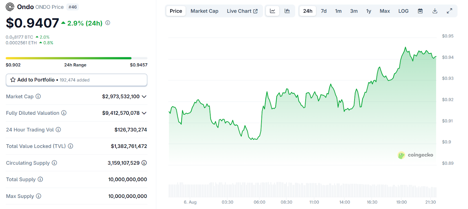 Dieser doppelte Ansatz schafft gleichzeitig Liquidität und Glaubwürdigkeit. Bei einem Kurs von 0,94 $ ist ONDO in den letzten 24 Stunden um 3 % gestiegen. Die Annahme, dass RWAs den nächsten Zyklus dominieren werden – unterstützt durch Aktivitäten von Schwergewichten wie BlackRock – treibt ONDOs Momentum weiter an. Als klarer First Mover dürfte Ondo überproportional vom wachsenden institutionellen Interesse an Tokenisierung profitieren.