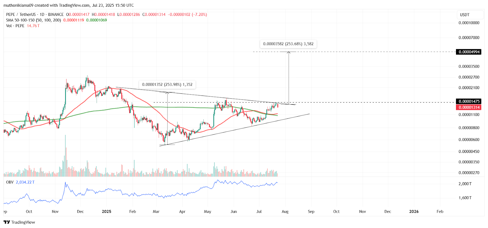 Wenn Sie PEPE verschlafen haben, könnte jetzt die Zeit sein, aufzuwachen. Trotz eines leichten Rückgangs schreien die technischen Signale nach Bullen. Das Open Interest von PEPE hat erstmals 1 Milliarde $ überschritten, Waltransaktionen sind um 107 % gestiegen, und der soziale Buzz hat PEPE auf LunarCrush unter die Top 3 gebracht. Der Preis ist in einem symmetrischen Dreieck eingeklemmt und hat den Widerstand bereits dreimal getestet – klassische Anzeichen für einen Ausbruch. Wenn er 0,0000147 $ überschreiten kann, sagen Analysten, könnte schnell eine Rally von 253 % auf 0,00005 $ folgen. Die Bullen kreisen.