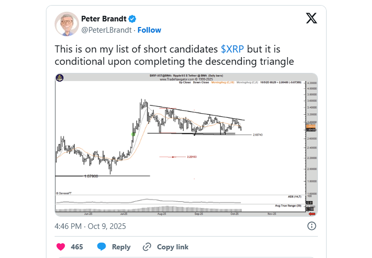 Peter Brandt hat Ripple derweil als einen seiner kurzfristigen Short-Kandidaten bezeichnet. In einem aktuellen X-Post erklärte er, dass XRP sich innerhalb eines absteigenden Dreiecks bewegt. Sollte ein Ausbruch nach unten erfolgen, prognostiziert Brandt einen möglichen Rückgang auf 2,22 $.