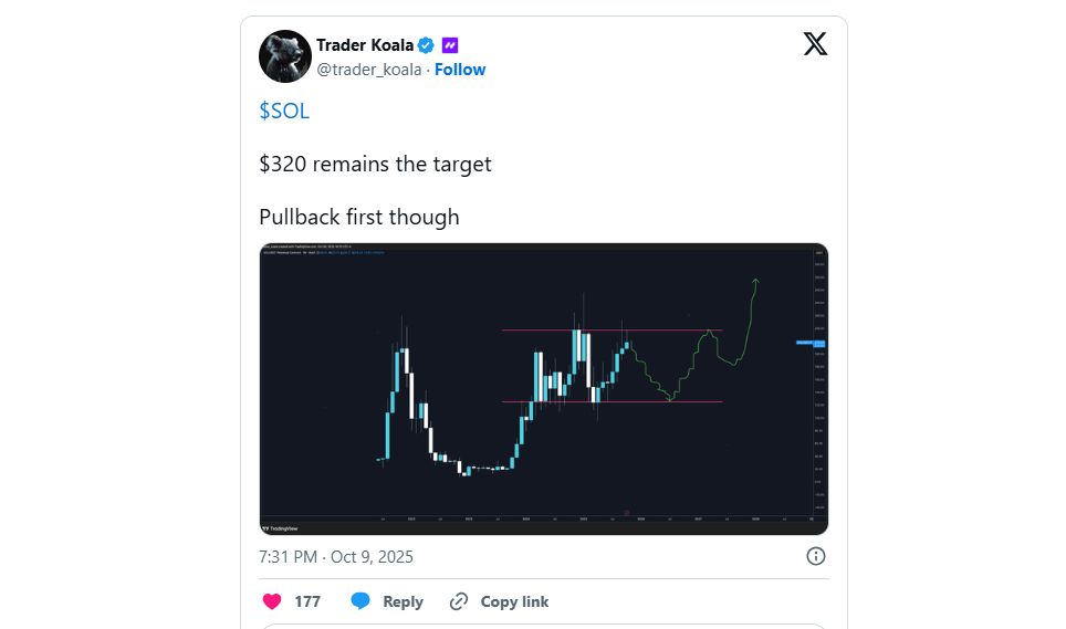 Crypto Rover erklärte kürzlich in einem Tweet, dass Solana als nächstes nach Binance Coin „abheben“ werde. Seiner Meinung nach könnte der Preis in den nächsten Monaten 500 $ erreichen. Trader Koala erwartet zunächst einen Rücksetzer, gefolgt von einem Anstieg auf 320 $.