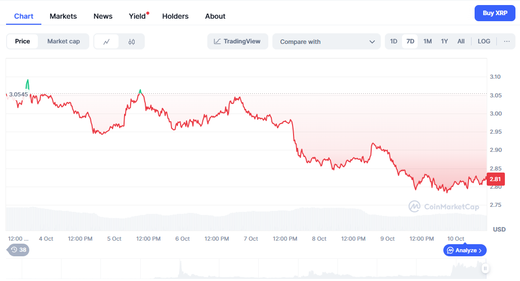 Ripple steht unter Druck, nachdem es nicht gelungen ist, die 3,00-$-Zone zurückzuerobern. Der XRP-Kurs ist nun in den Bereich von 2,80 $ gefallen – ein Rückgang von 7,6 % auf dem Wochenchart laut CoinMarketCap.