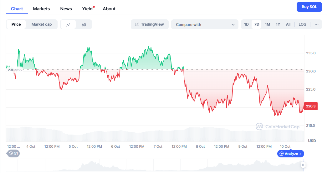 Solana befindet sich derzeit in einer Korrektur, nachdem die Marke von 240–245 $ mehrfach getestet, aber nicht durchbrochen wurde. Laut CoinMarketCap ist der SOL-Kurs auf Wochensicht um 5,3 % gefallen.