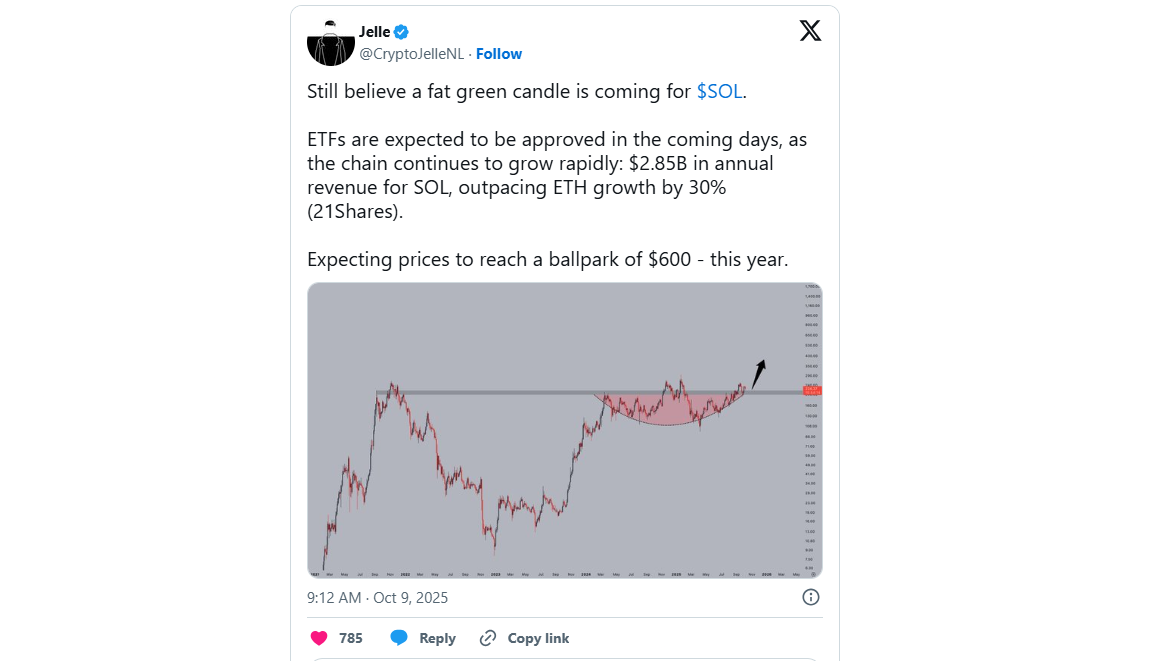 Auch Analyst Jelle zeigt sich bullisch für Solana. Seiner Einschätzung nach könnte die erwartete Genehmigung von Solana-ETFs bis Oktober zu weiteren Kapitalzuflüssen führen – was den SOL-Token auf bis zu 600 $ treiben könnte.
