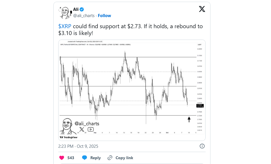 Auf der Oberseite bemerkte Ali Charts, dass der Ripple-Kurs in den kommenden Tagen auf 3,10 $ steigen könnte, wenn die Bullen über 2,73 $ bleiben. Außerdem erklärte STEPH IS CRYPTO, dass eine mögliche Genehmigung eines Ripple-ETFs bis zum 18. Oktober den Preis von XRP auf 5,00 $ treiben könnte.