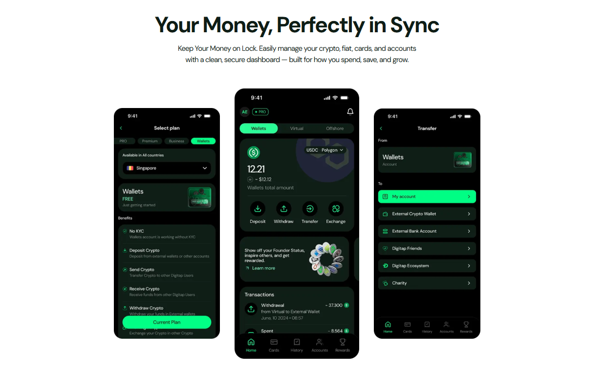 Die Multi-Wallet-Funktion ermöglicht es Nutzern, Krypto und Bargeld gleichzeitig zu verwenden, ohne mehrere Apps zu benötigen. Zur Sicherheit verfügt Digitap über integrierte Zwei-Faktor-Authentifizierung und Benachrichtigungssysteme.