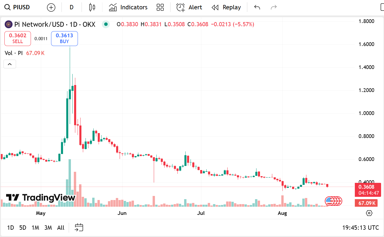 Der Pi Network Token wird derzeit bei 0,3571 US-Dollar gehandelt, was einem Rückgang von 7,68 % entspricht. Trotz dieses Rückschlags hält Pi weiterhin eine Marktkapitalisierung von 2,8 Milliarden US-Dollar und ein Handelsvolumen von 66,05 Millionen US-Dollar, das in den letzten 24 Stunden um über 134 % gestiegen ist. Dies zeigt, dass trotz anhaltendem Verkaufsdruck Trader stark auf seine kurzfristige Richtung spekulieren.