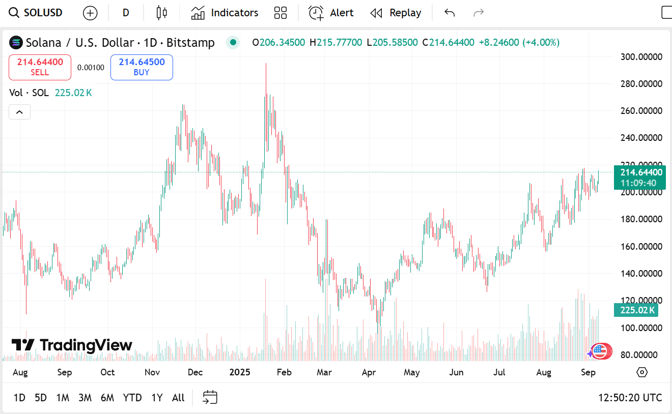 Solana wird bei 214,64 US-Dollar gehandelt, ein Plus von 5,08 % am Tag, mit einer Marktkapitalisierung von 116,02 Milliarden US-Dollar. Sein Handelsvolumen stieg auf 7,74 Milliarden US-Dollar – ein Zuwachs von stolzen 158,74 % –, was die starke Nachfrage nach einem Krypto-Netzwerk mit niedrigen Transaktionsgebühren unterstreicht.