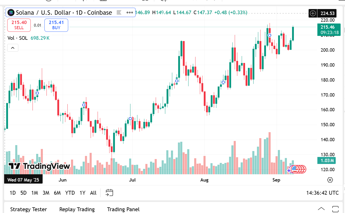 Solana hält sich stabil bei 215,40 US-Dollar nach einem Anstieg von 5,07 % in den letzten 24 Stunden. Die Marktkapitalisierung liegt nun bei 115,97 Milliarden US-Dollar, nachdem das Handelsvolumen deutlich auf 8,7 Milliarden US-Dollar gestiegen ist – ein Plus von 191,49 % im Vergleich zum Vortag.