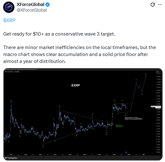 XForceGlobal, ein Analyst mit 35.000 Followern auf X, gab kürzlich eine kühne XRP-Prognose ab. Trotz kleiner Marktineffizienzen in kurzfristigen Zeitrahmen identifizierte er auf dem Makro-Chart eine klare Akkumulation und eine stabile Preisunterstützung. Daher hält er 10 $ für ein konservatives Ziel während der dritten Welle.