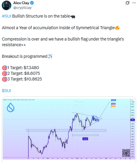 Alex Clay, ein Top-Analyst mit über 27.000 Followern auf X, identifizierte eine starke Akkumulation innerhalb eines symmetrischen Dreiecks und einen bevorstehenden Ausbruch. Sein erstes Ziel liegt bei 7,2 $, gefolgt von 8,6 $ und schließlich 10,8 $. Mit einem DEX-Volumen von 3,7 Milliarden $ in den letzten sieben Tagen kann ein weiterer Anstieg des SUI-Preises auf neue Höchststände nicht ausgeschlossen werden.