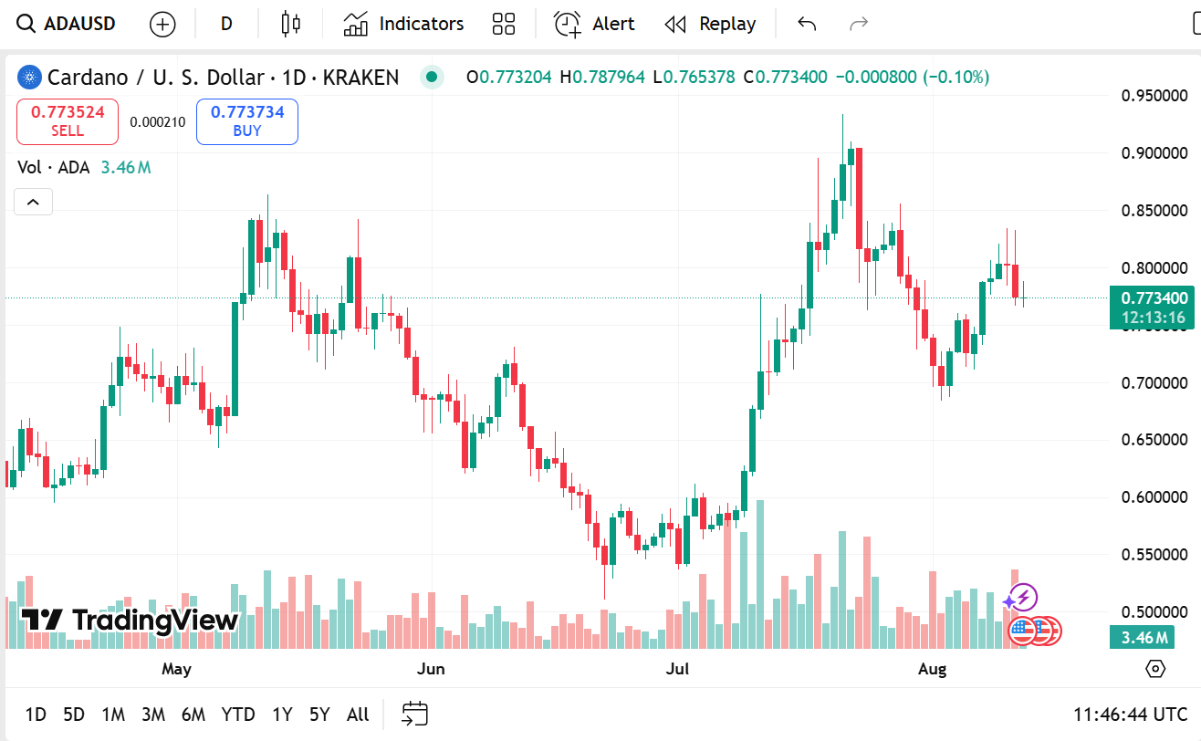 Cardano (ADA) liegt bei 0,7896 US-Dollar, 1,32 % niedriger in den letzten 24 Stunden, mit einer Marktkapitalisierung von 27,26 Milliarden US-Dollar. Das Handelsvolumen liegt bei 1,21 Milliarden US-Dollar, ein Anstieg von 8,48 %.
