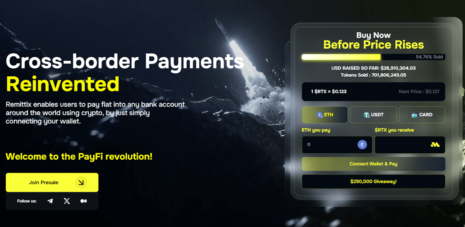 Während all das passiert, zeichnet sich ein leiser Wandel ab – hin zu Projekten mit echter Nutzbarkeit. Remittix (RTX) sorgt aktuell in Presale-Chats für Aufsehen: Der zeitlich begrenzte 300 %-Bonus bringt viele dazu, jetzt einzusteigen, bevor das Angebot endet.