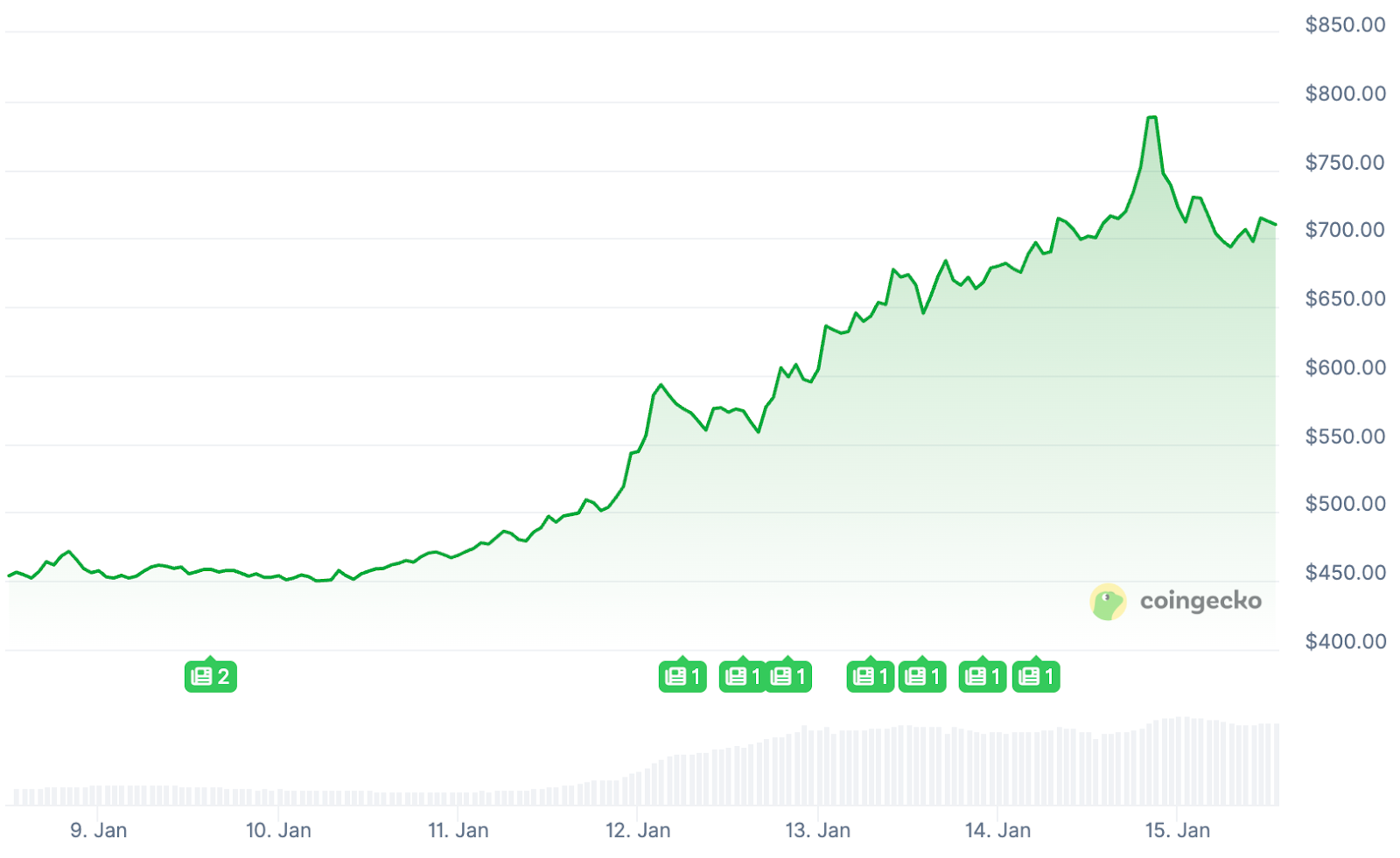 Besonders auffällig war gestern eine kurze, explosive Kursbewegung. Der XMR-Kurs kletterte innerhalb von Stunden von 700 auf ein neues Rekordhoch von 800 Dollar.