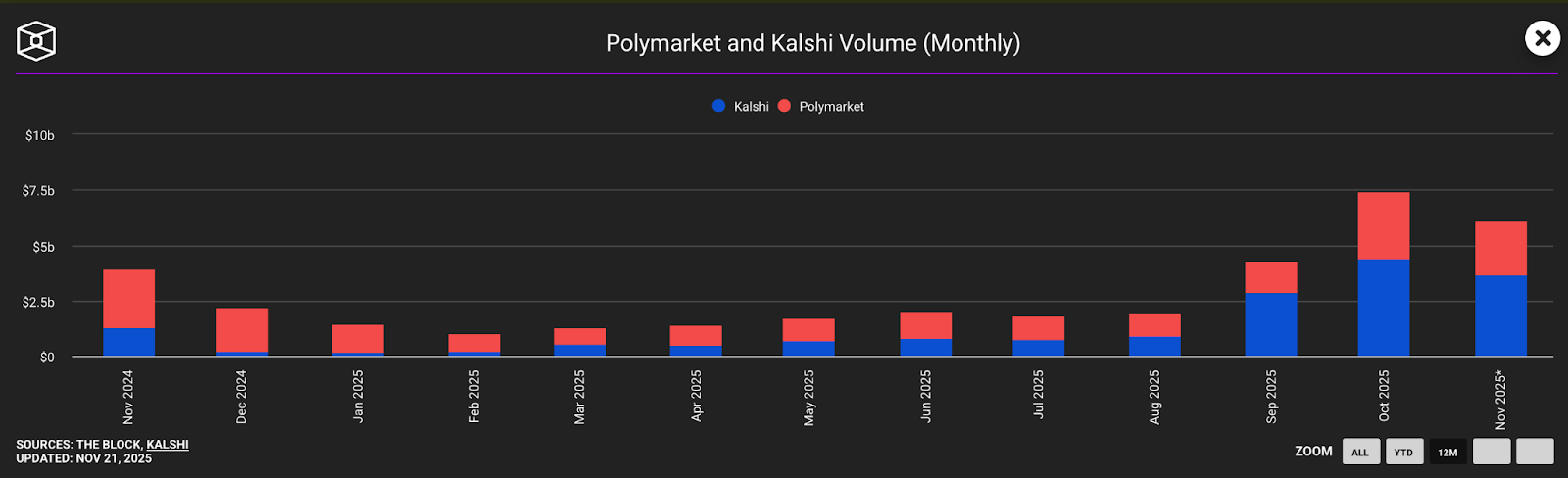 Die Verdopplung von Kalshis Bewertung fällt in eine Phase, in der Prognosemärkte stark an Fahrt aufnehmen. Im Oktober erzielten Kalshi und Wettbewerber Polymarket zusammen ein Rekordhandelsvolumen von fast 7,5 Milliarden Dollar. Mit bislang 6,1 Milliarden Dollar Handelsvolumen im November steuert auch dieser Monat darauf zu, die Bestmarke zu übertreffen, wie Daten von The Block zeigen.