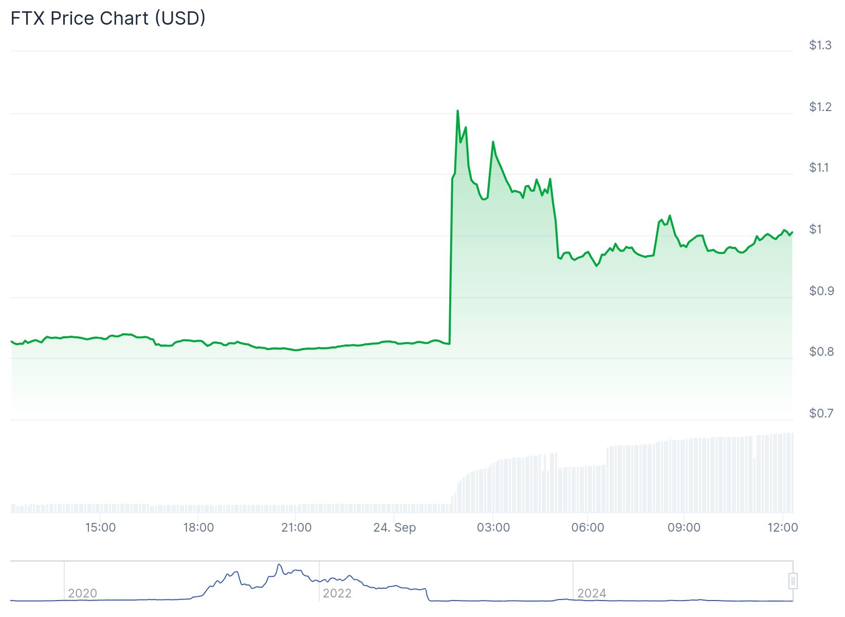 Dennoch war die Nachricht ausreichend, um ein Feuerwerk auf dem Kryptomarkt zu entfachen. Der FTT-Token, einst das Herzstück der mittlerweile bankrotten FTX-Börse, stieg um etwa 42 Prozent in nur 20 Minuten. Der Kurs erreichte einen Höchstwert von 1,15 Dollar, während das Handelsvolumen innerhalb von 24 Stunden nahezu vervierfachte: von etwa 10,4 Millionen auf 59 Millionen Dollar.