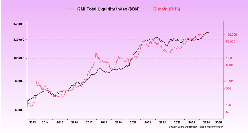 Dann teilt er eine Grafik, die eine Korrelation zwischen dem Preis von Bitcoin und der globalen Liquidität nahelegt, der Menge an Kapital, die weltweit durch die Finanzmärkte fließt.