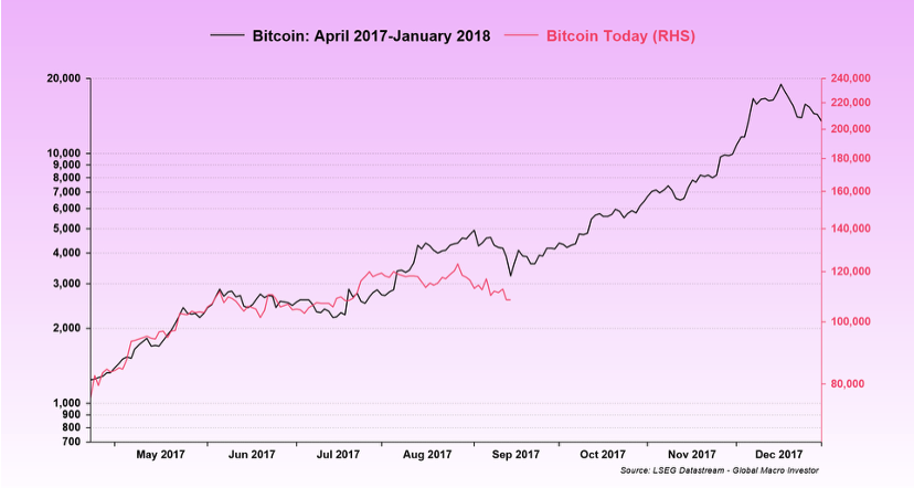 Er denkt nämlich, dass Bitcoin eine mit 2017 vergleichbare Periode durchmachen könnte. „Und das einzige, worum du dich sorgst, ist, dass September schwach sein wird. Wenn das deine Denkweise ist, bist du nicht zu retten. Das ist die aktuelle Preisaktion im Vergleich zu 2017,“ zeigt er eine neue Grafik.