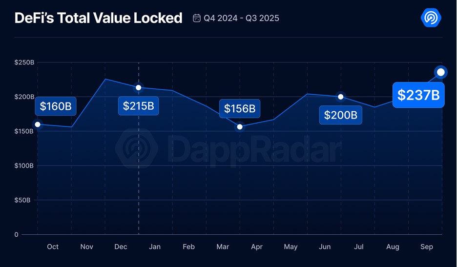 Die Welt der dezentralen Finanzanwendungen (DeFi) erreichte im dritten Quartal 2025 einen neuen Rekord. Laut Zahlen von DappRadar waren Ende September 237 Milliarden US-Dollar in DeFi-Protokollen gebunden. Doch nicht alles war positiv: Die Zahl der aktiven Nutzer ging deutlich zurück.