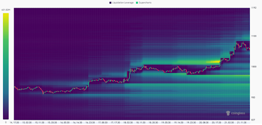 Laut Daten von Coinglass gibt es auch knapp über dem Niveau von 1.000 Dollar viel Liquidität. Dies könnte kurzfristig ein Kursziel sein.