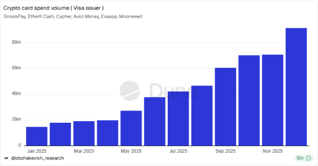 Daten des Analyseplattform Dune Analytics zeigen, dass der Einsatz von Visa-Krypto-Karten im Jahr 2025 deutlich gestiegen ist. Die Gesamtausgaben mit sechs in Zusammenarbeit mit Visa ausgegebenen Karten stiegen im Laufe des Jahres um 525 Prozent. Im Januar lag der Gesamtbetrag noch bei 14,6 Millionen Dollar, während er Ende Dezember auf 91,3 Millionen Dollar anstieg.