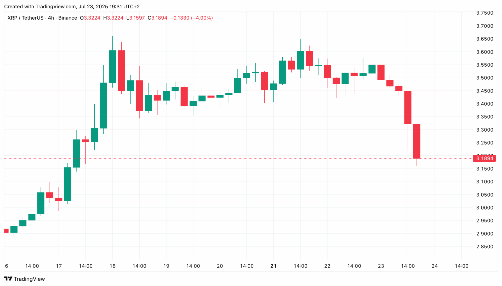 Für XRP ist der Rückgang besonders schmerzhaft. Zum Zeitpunkt des Schreibens liegt der Kurs bei etwa 3,21 Dollar, während die Münze gestern noch um die 3,60 Dollar schwankte. Damit fällt XRP an einem Tag fast zehn Prozent. Die Korrektur folgt auf Wochen starker Kursgewinne.