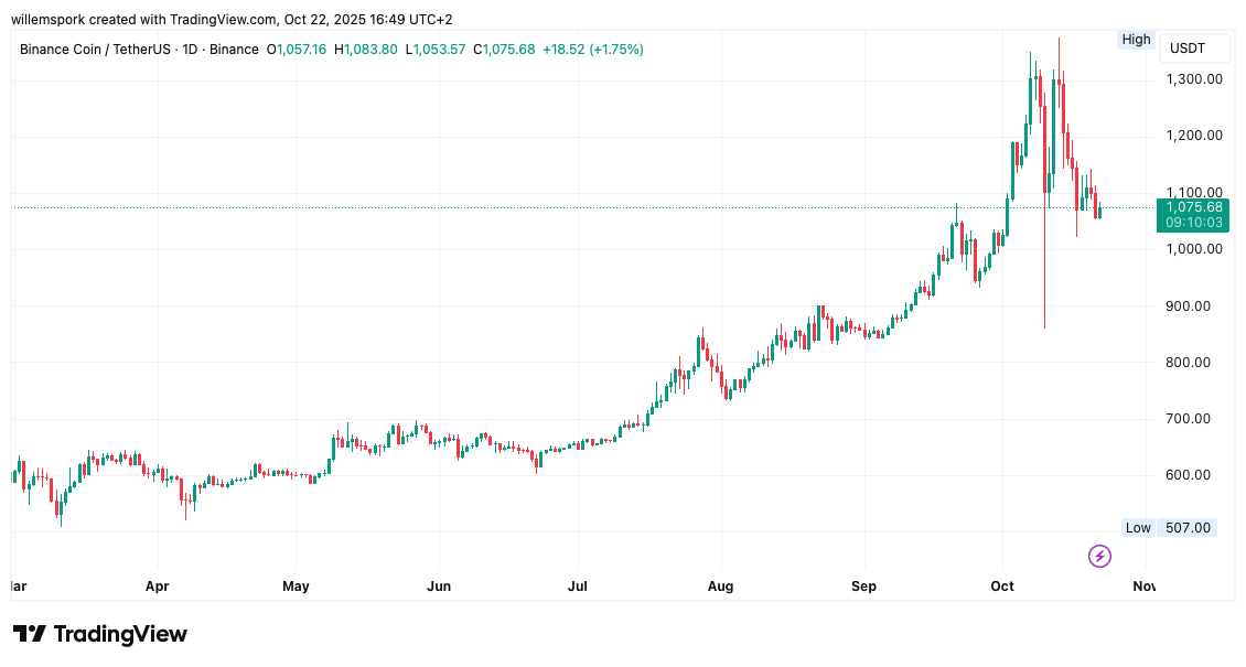 Zum Zeitpunkt des Schreibens handelt BNB bei rund 1.075 US‑Dollar. Der Token hat in den vergangenen Monaten eine beeindruckende Rally hingelegt und erreichte früher im Monat eine Marktkapitalisierung von 191 Milliarden US‑Dollar. Seither ist ein Teil dieser Gewinne wieder verpufft, doch das Momentum bleibt stark.