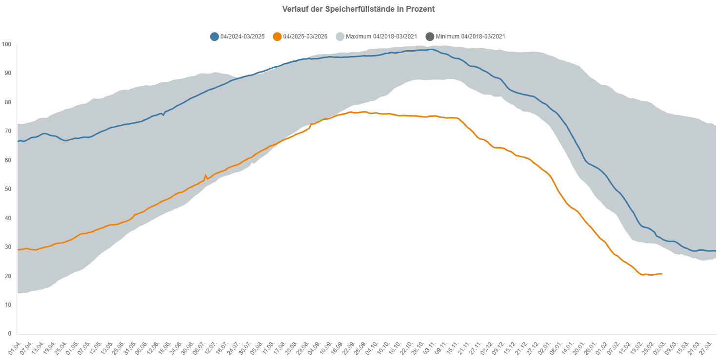 Besonders kritisch wird die Lage am Gasmarkt bewertet: Die Gaspreise haben sich in Deutschland nahezu verdoppelt, während die Lagerstände mit 21 Prozent auf einem saisonal niedrigen Niveau liegen.