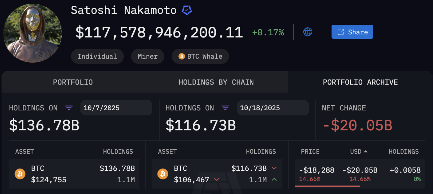 Den Daten von Arkham Intelligence zufolge hält Satoshi Nakamoto weiterhin über 1 Million Bitcoin. Zum aktuellen Kurs von etwa 108.000 Dollar pro BTC entspricht das einem Wert von rund 117,5 Milliarden Dollar. Beim Hoch Anfang Oktober, als Bitcoin sein neues Allzeithoch von über 126.000 Dollar markierte, war derselbe Bestand noch etwa 136 Milliarden Dollar wert.