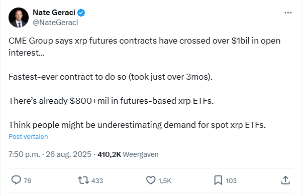 Laut ETF-Analyst Nate Geraci unterschätzt der Markt das Interesse an einem möglichen Spot XRP ETF. Er weist darauf hin, dass bereits mehr als 800 Millionen Dollar in ETFs investiert sind, die auf XRP-Futures basieren.