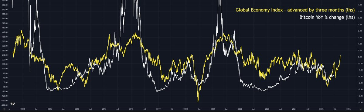 In der untenstehenden Grafik sehen wir die Korrelation zwischen Bitcoin und dem Global Economy Index, der um drei Monate vorgespult ist.