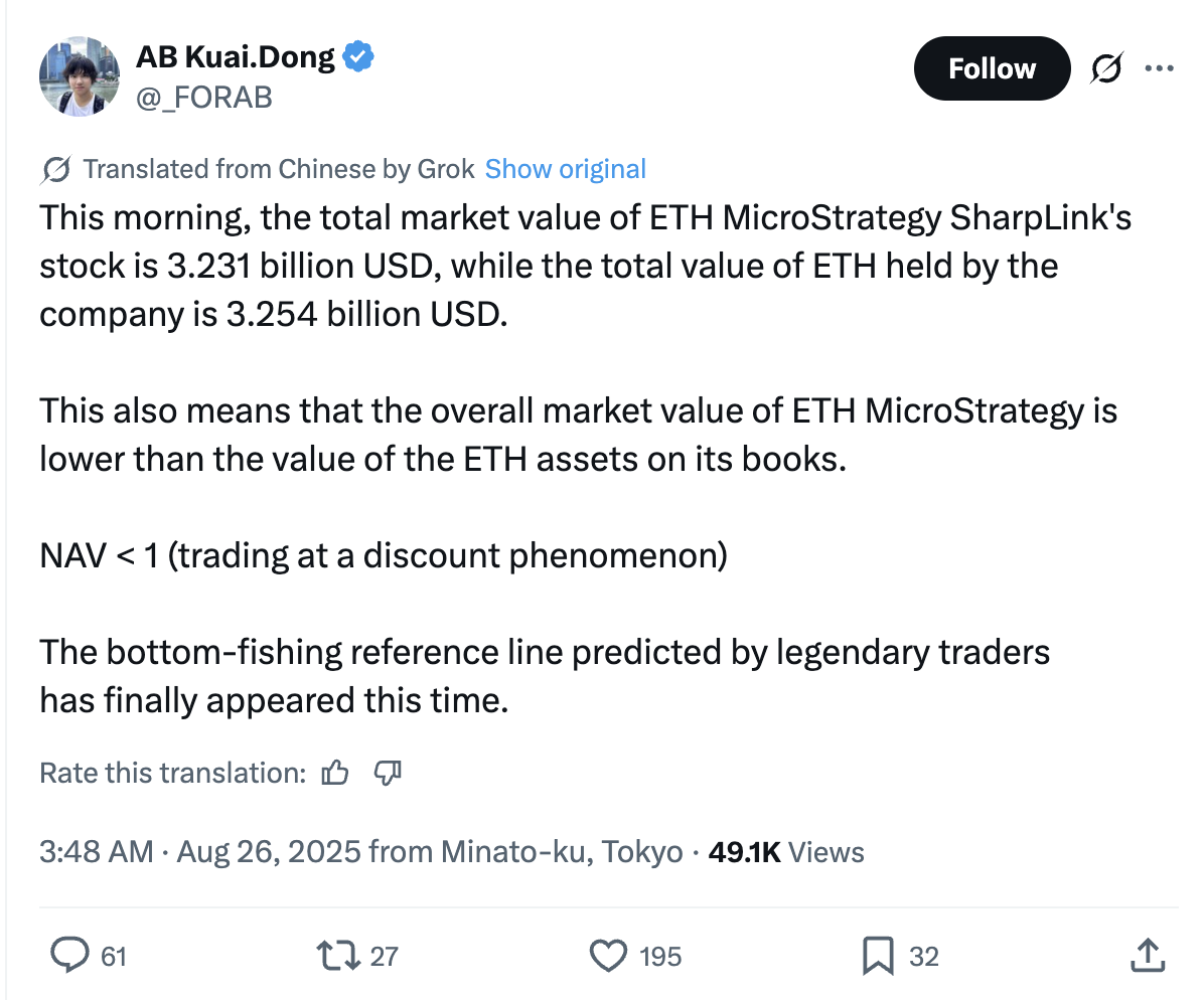 SharpLink hat laut den neuesten Zahlen Ethereum im Wert von 3,29 Milliarden Dollar, während die gesamte Börsenbewertung des Unternehmens bei etwa 3,24 Milliarden Dollar liegt. Das bedeutet, dass Investoren das Unternehmen weniger schätzen als die Kryptowährung, die es in der Kasse hat.