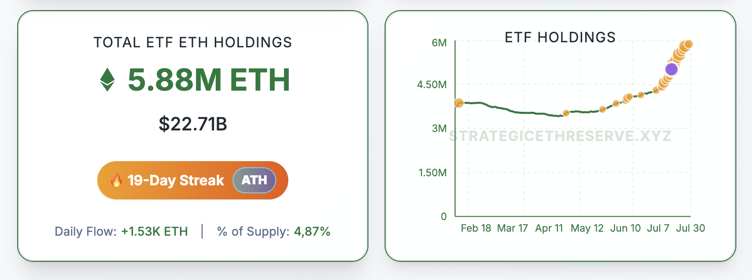 Auch die ETFs machen sehr gut mit einem Gesamt von 5,88 Millionen Ethereum. Diese Ether tragen derzeit einen Wert von 22,71 Milliarden Dollar. Auch für die ETF-Holdings sehen wir die Grafik fast in einer geraden Linie nach oben gehen.