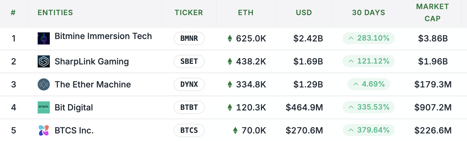 Im Bereich der Ethereum-Reserven ist SharpLink Gaming noch nicht der Größte. Diese Ehre gebührt Bitmine Immersion Tech, die 625.000 Ethereum besitzen, was einem Gesamtwert von 2,42 Milliarden Dollar entspricht.