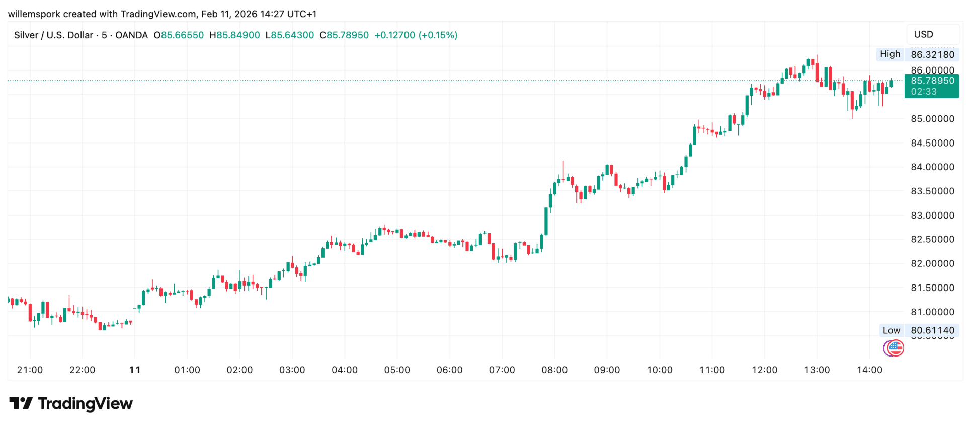 Spot-Silber stieg um 6,6 Prozent auf 85,98 Dollar pro Unze. Der Kurs begann bereits in den Morgenstunden stark zuzulegen und erreichte kurz nach Mittag seinen Höchststand. Auch andere Edelmetalle wie Gold (+1,8 Prozent) und Platin (+4,8 Prozent) legten zu, unterstützt durch einen fallenden Dollar und sinkende US-Zinsen.