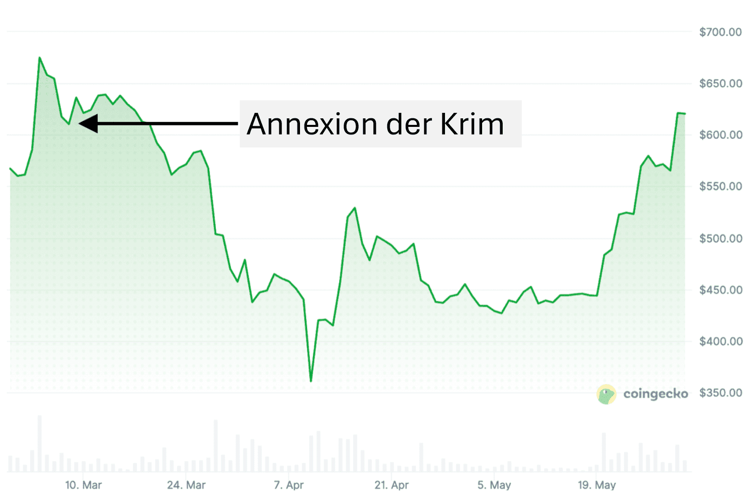 Auch nach der Annexion der Krim 2014 folgte ein deutlicher Rückgang. Innerhalb von etwa drei Wochen sank Bitcoin von rund 610 Dollar auf etwa 360 Dollar. Das entspricht einer Abnahme von etwa 41 Prozent.