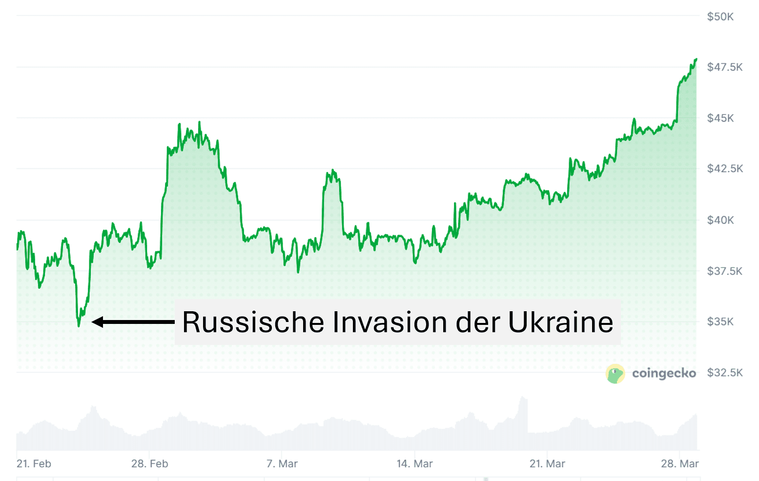 Das wurde während der russischen Invasion in der Ukraine im Februar 2022 deutlich. Kurz nach Kriegsausbruch fiel Bitcoin von etwa 39.000 Dollar auf rund 34.300 Dollar. Ein Verlust von fast dreizehn Prozent in kurzer Zeit.