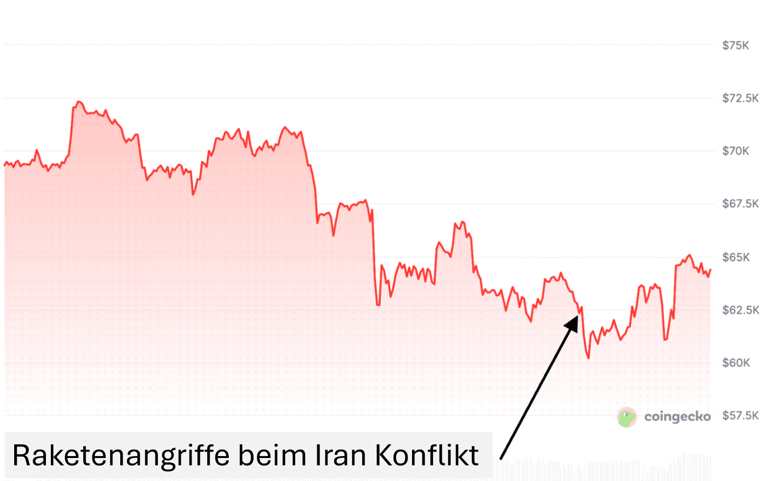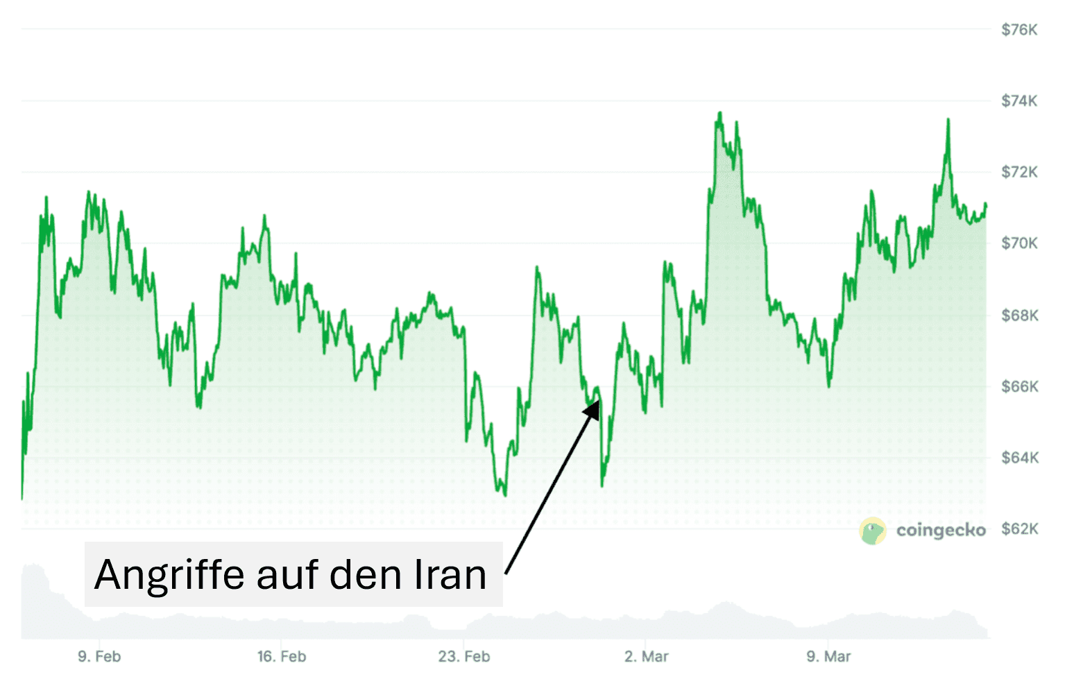 Auch bei den jüngsten Angriffen Ende Februar zeigt sich dieses Muster. Kurz vor den Angriffen Israels und der USA auf Iran lag der Bitcoin-Kurs bei rund 68.000 Dollar. Kurz danach fiel der Preis auf etwa 63.000 Dollar, ein Rückgang von mehr als sieben Prozent.